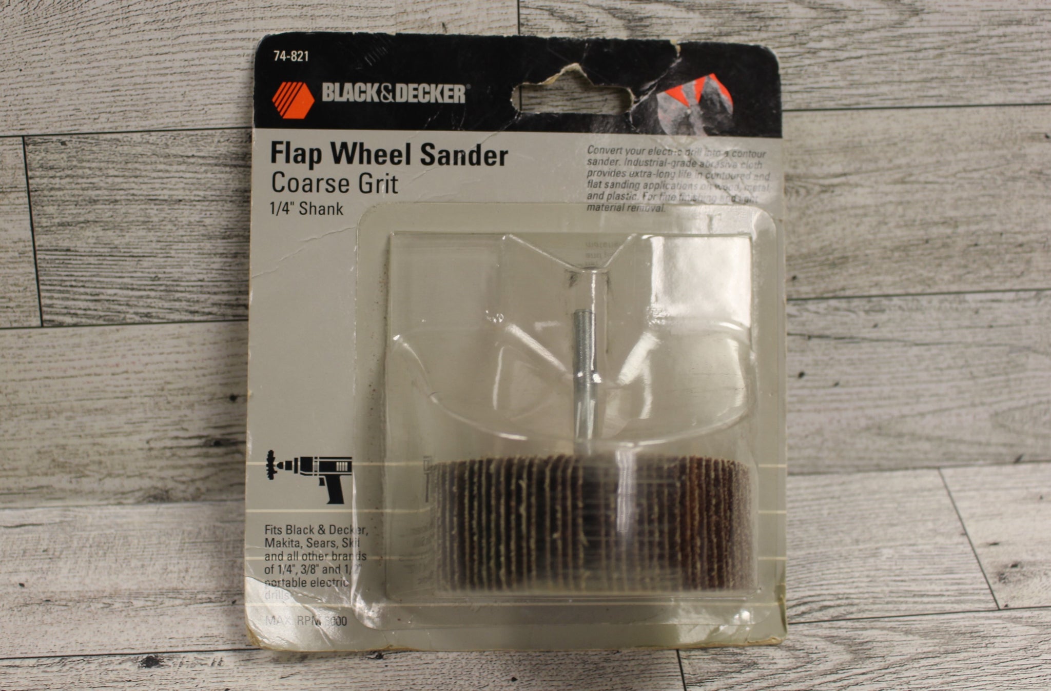 The Black & Decker flap wheel sander is an all-purpose sander that fits any electric drill. Specially designed for contoured sanding on a variety of materials such as metal, wood, fiberglass, plastic, rubber, or painted and rusted surfaces.